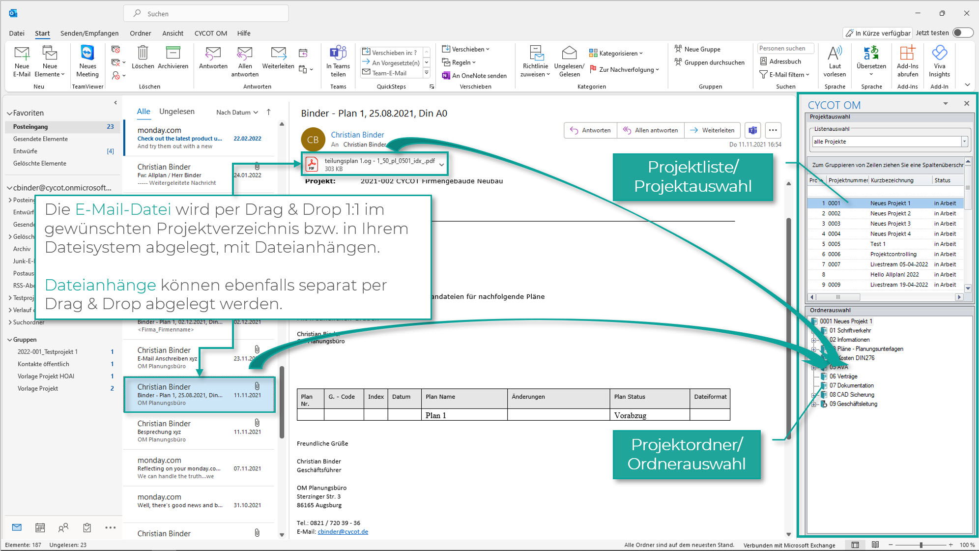 Über das Outlook Add-In können E-Mails und Datei-Anhänge per Drag & Drop in OM bzw. zu den Projekten zentral abgelegt werden.